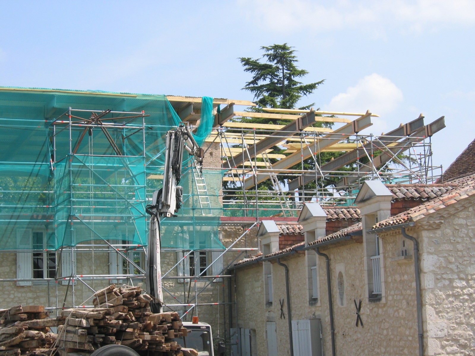 Restauration des charpentes en atelier avec une campagne de repérage de chaque ferme et de son emplacement avant dépose pour rénovation.