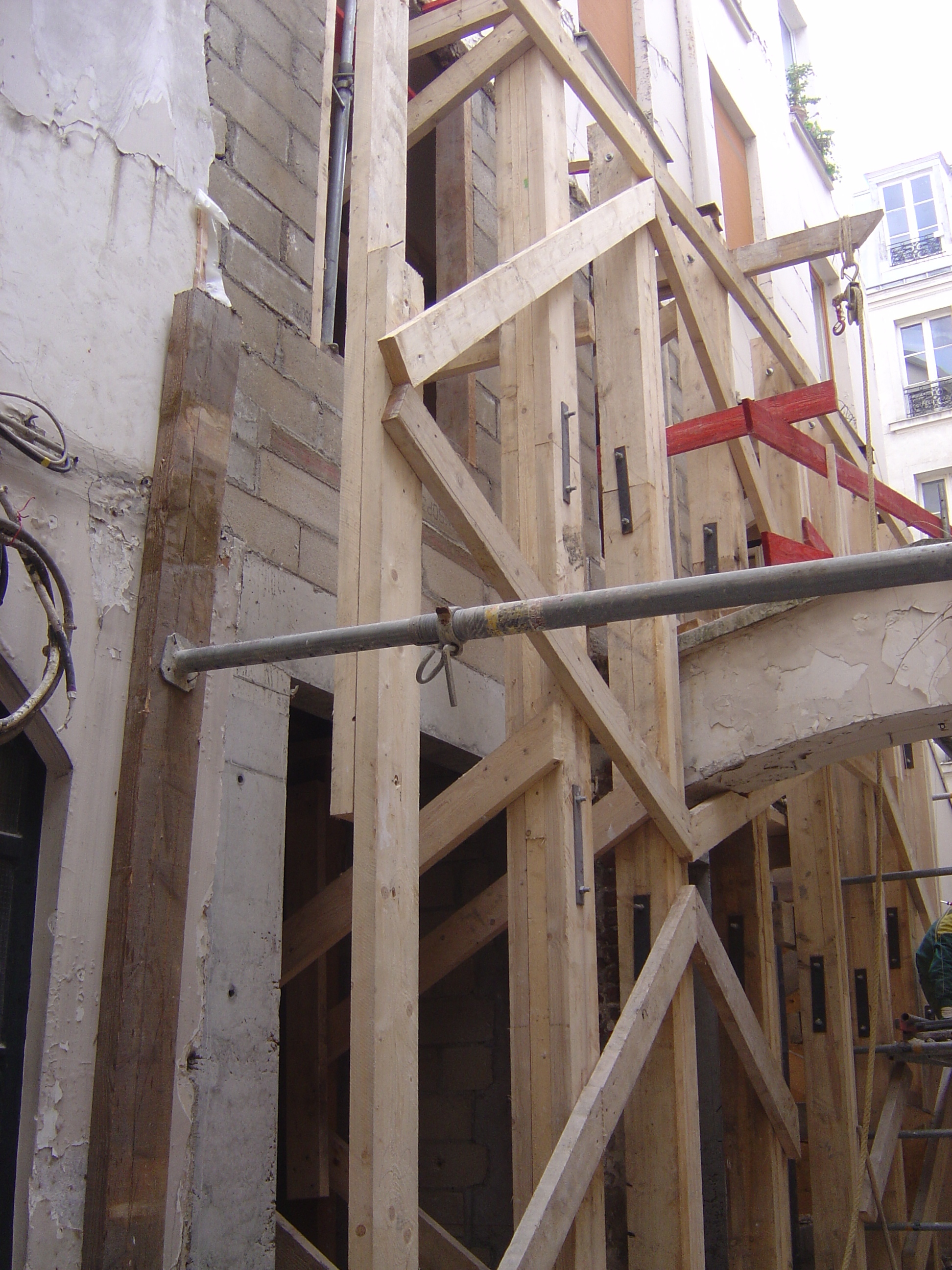 Les façades de la cour intérieure présentaient de nombreuses et importantes fissures structurelles. Le bâtiment a immédiatement été mis en sécurité par les Charpentiers de Paris. Ils ont installé des structures bois permettant de consolider les façades en attendant l'intervention définitive.