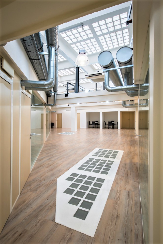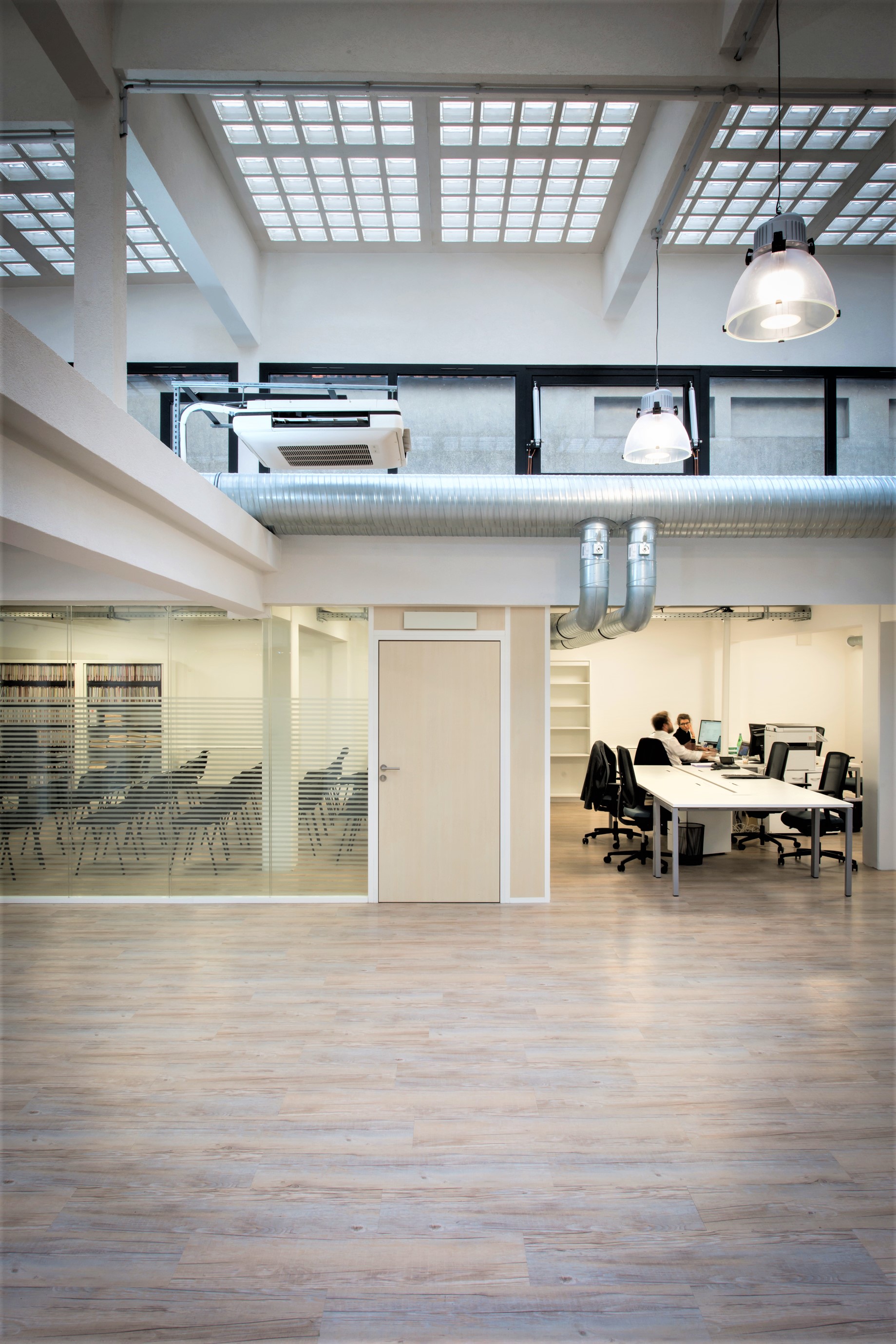 Mise aux normes de l'immeuble avec création des réseaux de climatisation et ventilation. L'ensemble des réseaux est laissé apparent, limitant les coffrages, et permettant de conserver le volume qualitatif offert par la toiture en pavé de verre.