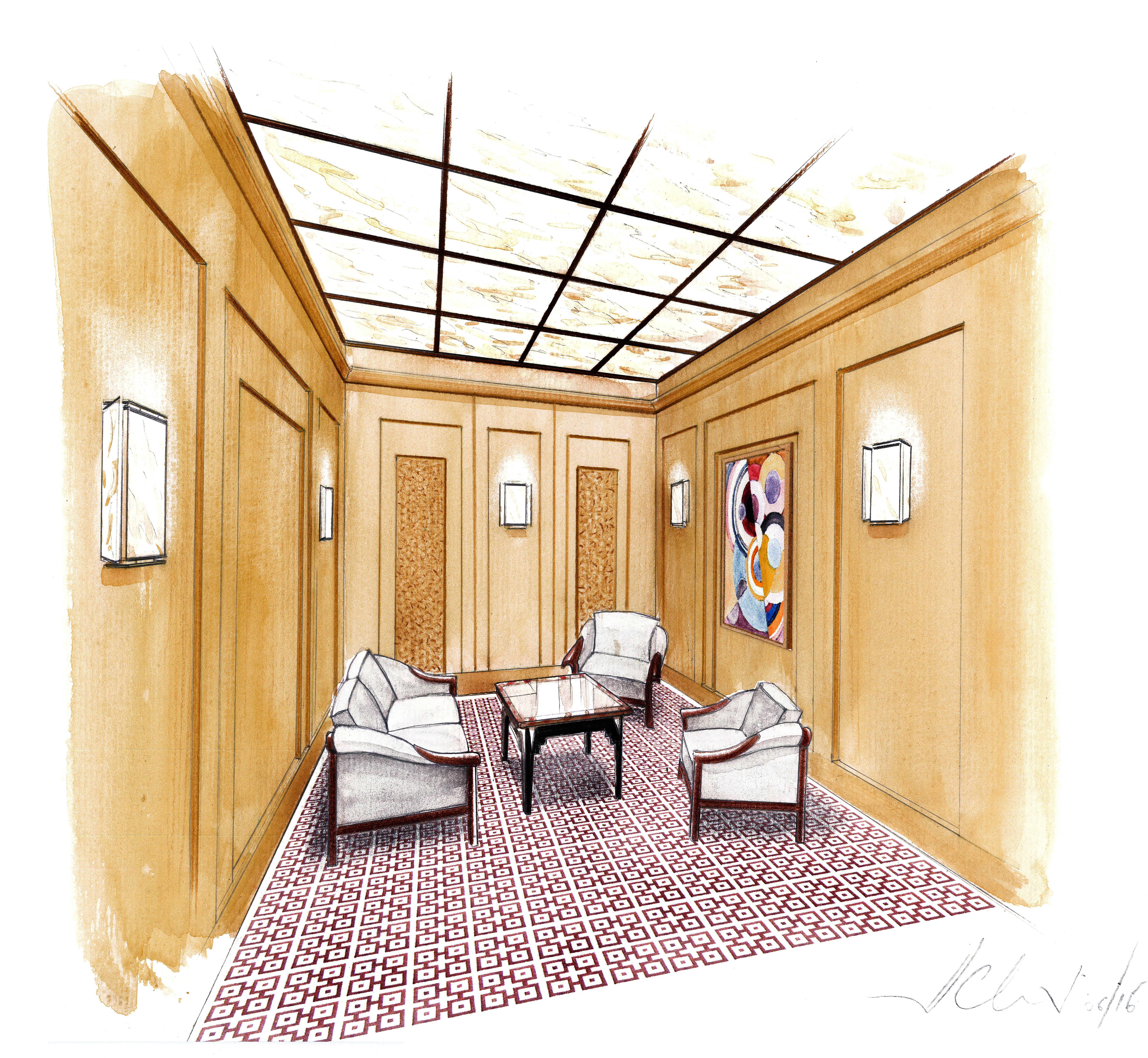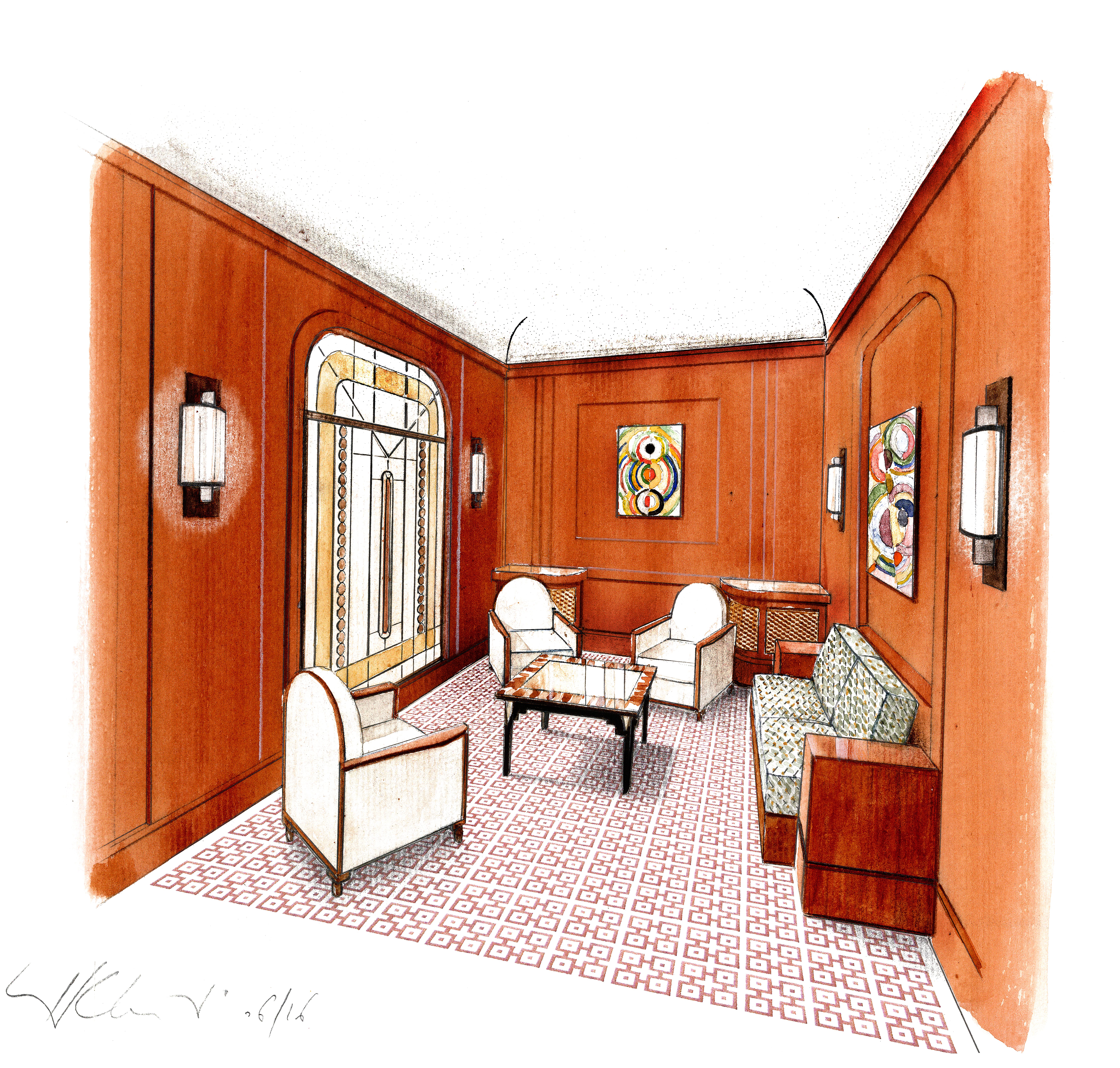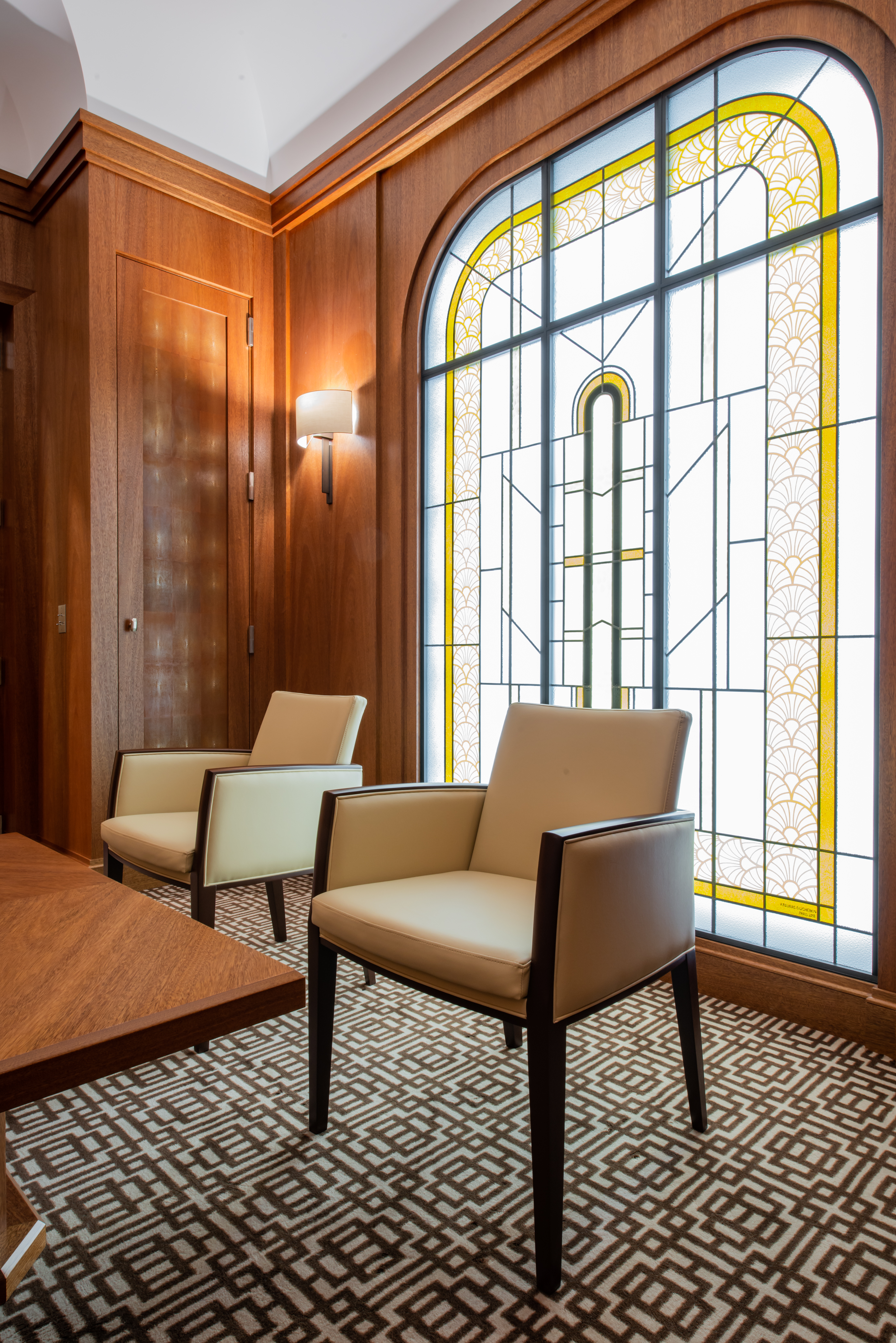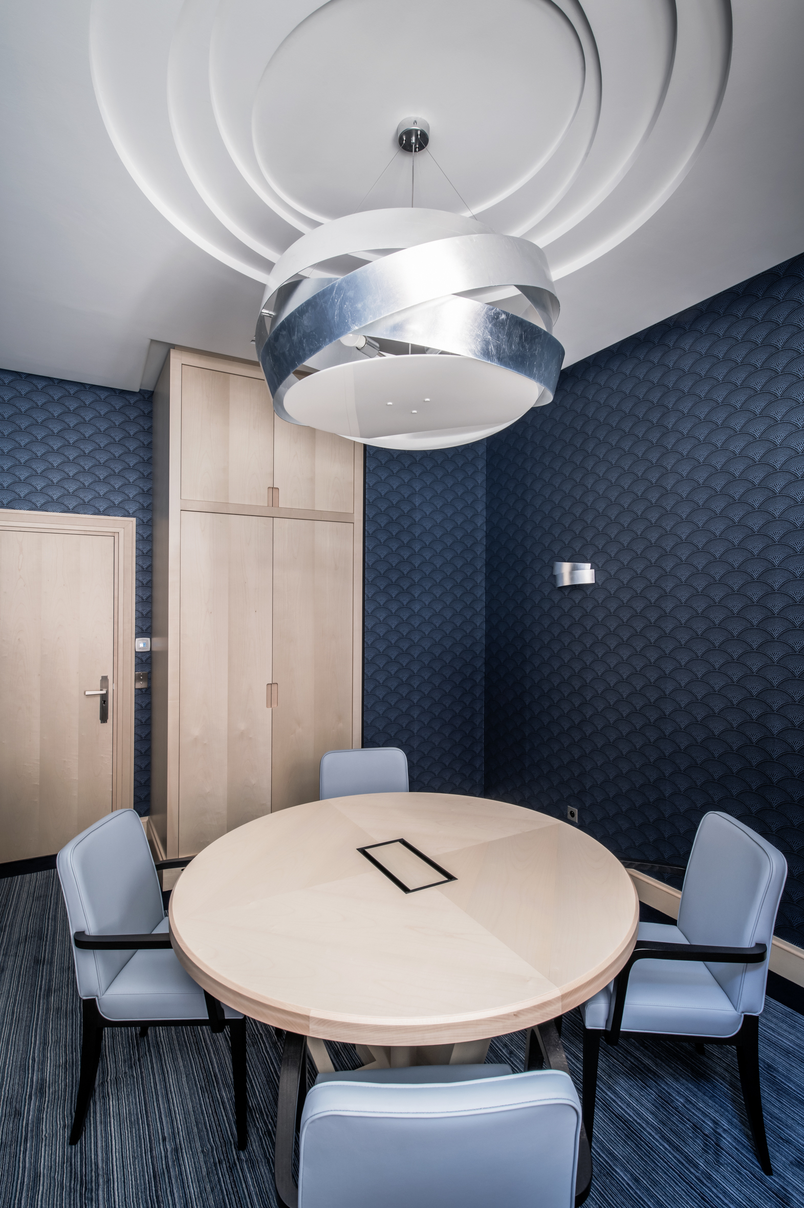 Création des salles de réunion. Nous nous sommes inspirés de la salle du Conseil et de la salle du restaurant privé, faits à l'époque par des artisans de renom, pour dessiner le décor de ces nouveaux salons. Sur les sept salons réalisés, trois sont dans le style année 30. Les boiseries, les corniches, les vitraux, les plafonds en trompe-l'œil se veulent au plus proches de ce qui aurait été réalisé à l'époque. Les quatre autres, plus modernes, reprennent les formes caractéristiques du courant, que l'on retrouve par touches sur les éléments de décors.