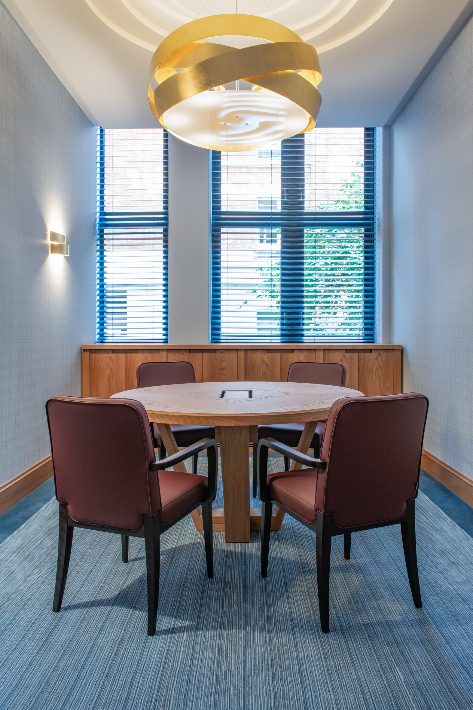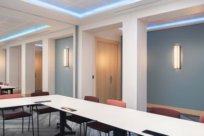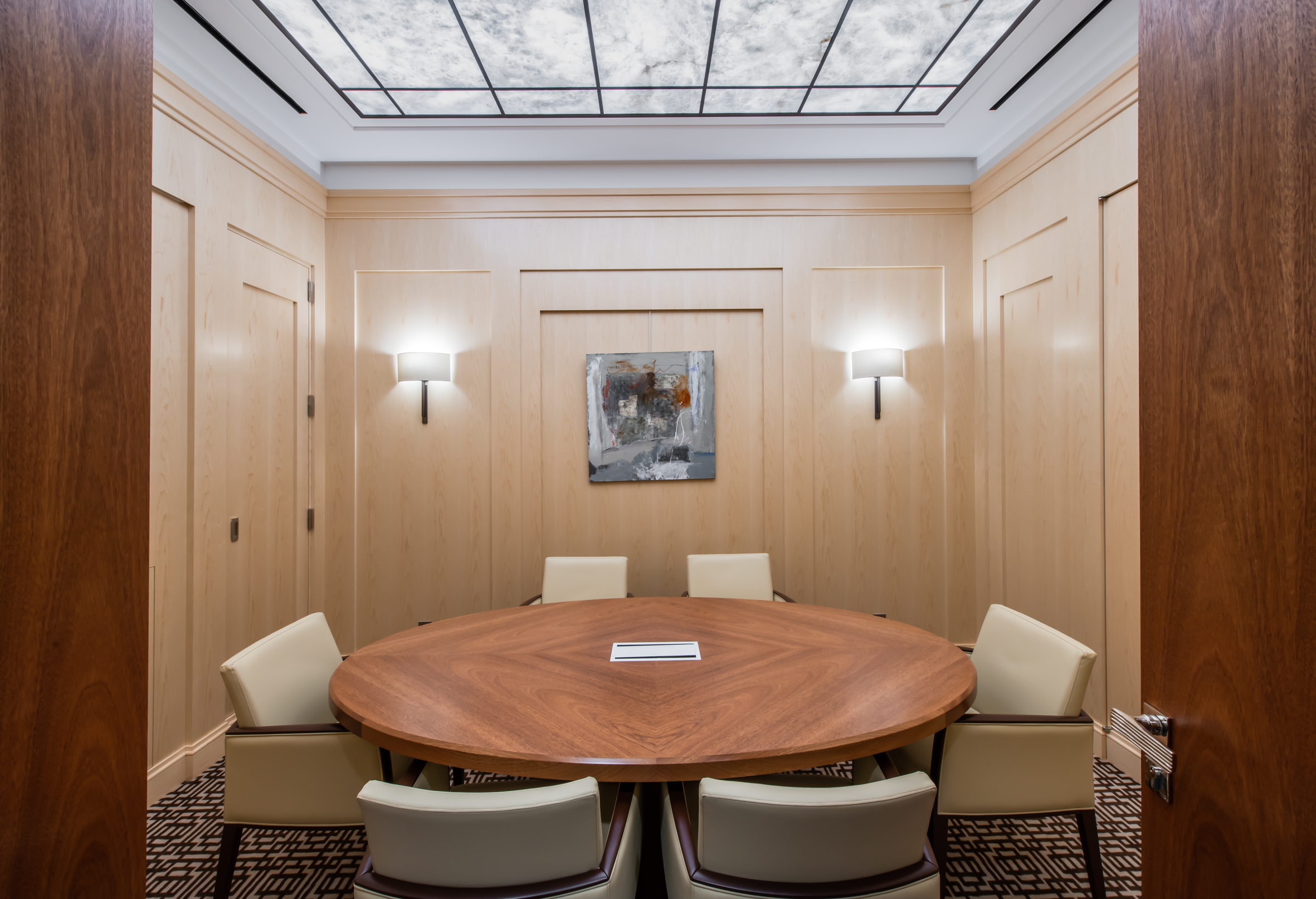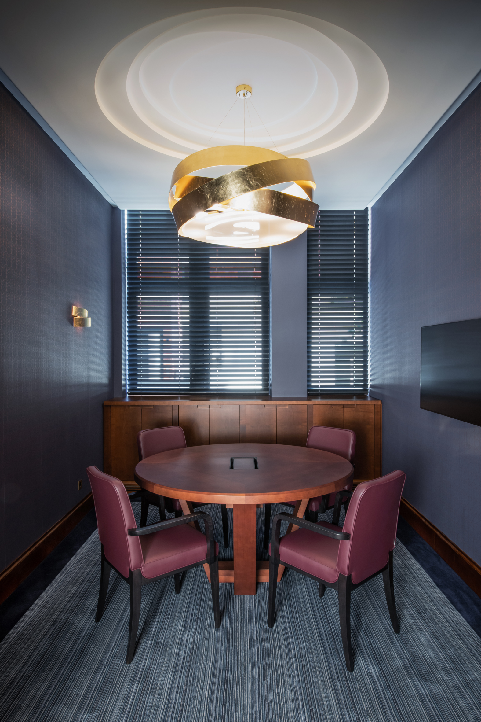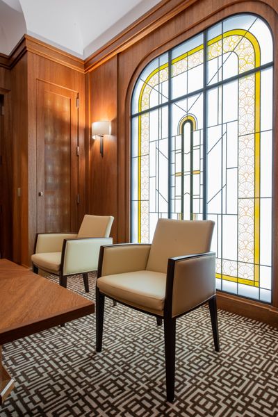 Création des salles de réunion. Nous nous sommes inspirés de la salle du Conseil et de la salle du restaurant privé, faits à l'époque par des artisans de renom, pour dessiner le décor de ces nouveaux salons. Sur les sept salons réalisés, trois sont dans le style année 30. Les boiseries, les corniches, les vitraux, les plafonds en trompe-l'œil se veulent au plus proches de ce qui aurait été réalisé à l'époque. Les quatre autres, plus modernes, reprennent les formes caractéristiques du courant, que l'on retrouve par touches sur les éléments de décors.