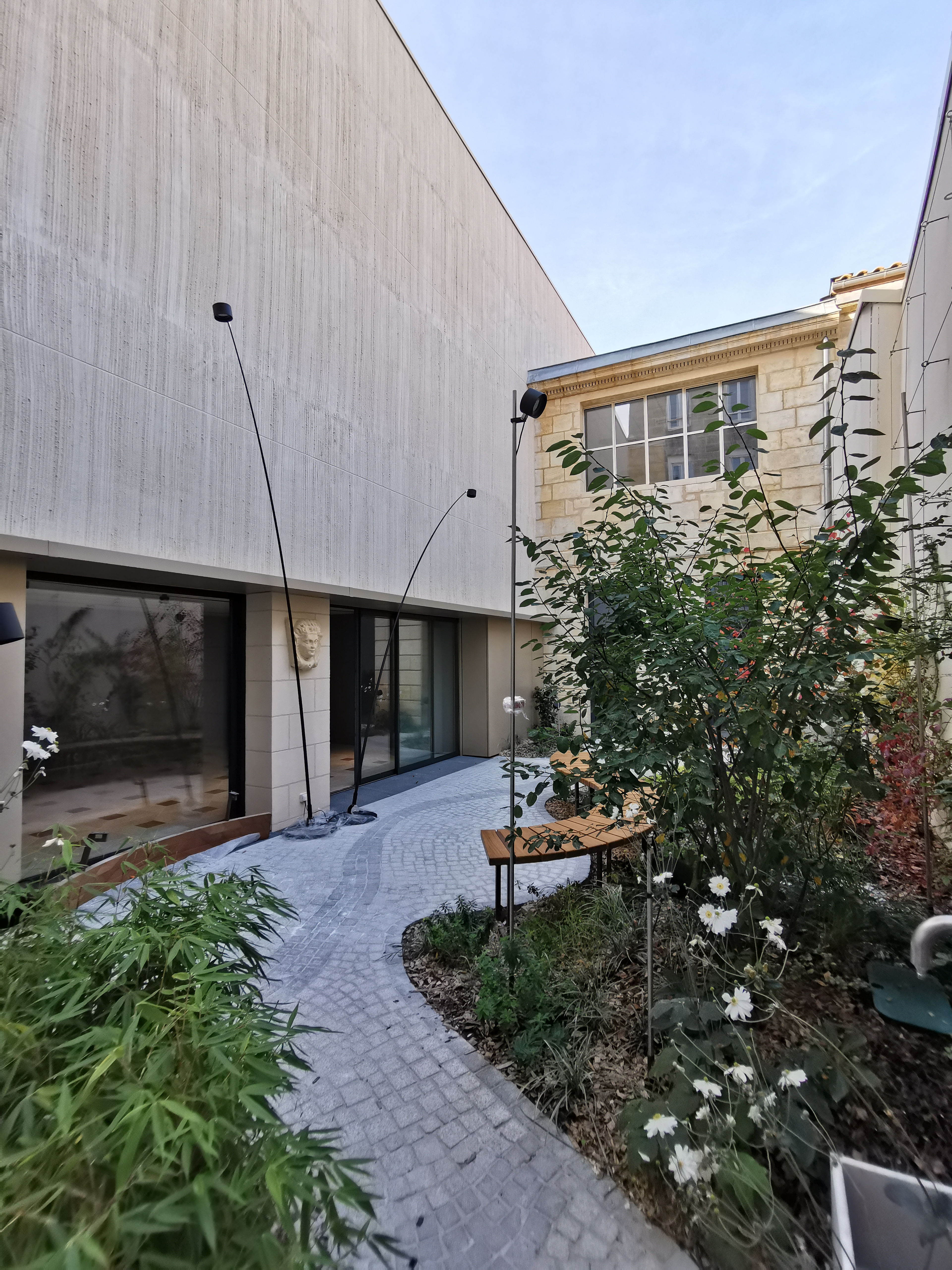 La cour intérieure a été entièrement réaménagée afin d'offrir un espace extérieur de qualité aux salles de travail donnant sur l'extérieur. La façade sur cour du musée présentait une importante partie opaque, due au programme du bâtiment. Un travail sur l'enduit modelé a été fait de manière à animer l'ensemble par un jeu de textures graphiques. Pour la rénovation des extérieurs, nous avons travaillé essentiellement avec des artisans locaux, nous assurant ainsi de reprendre les techniques et les codes architecturaux de la région.